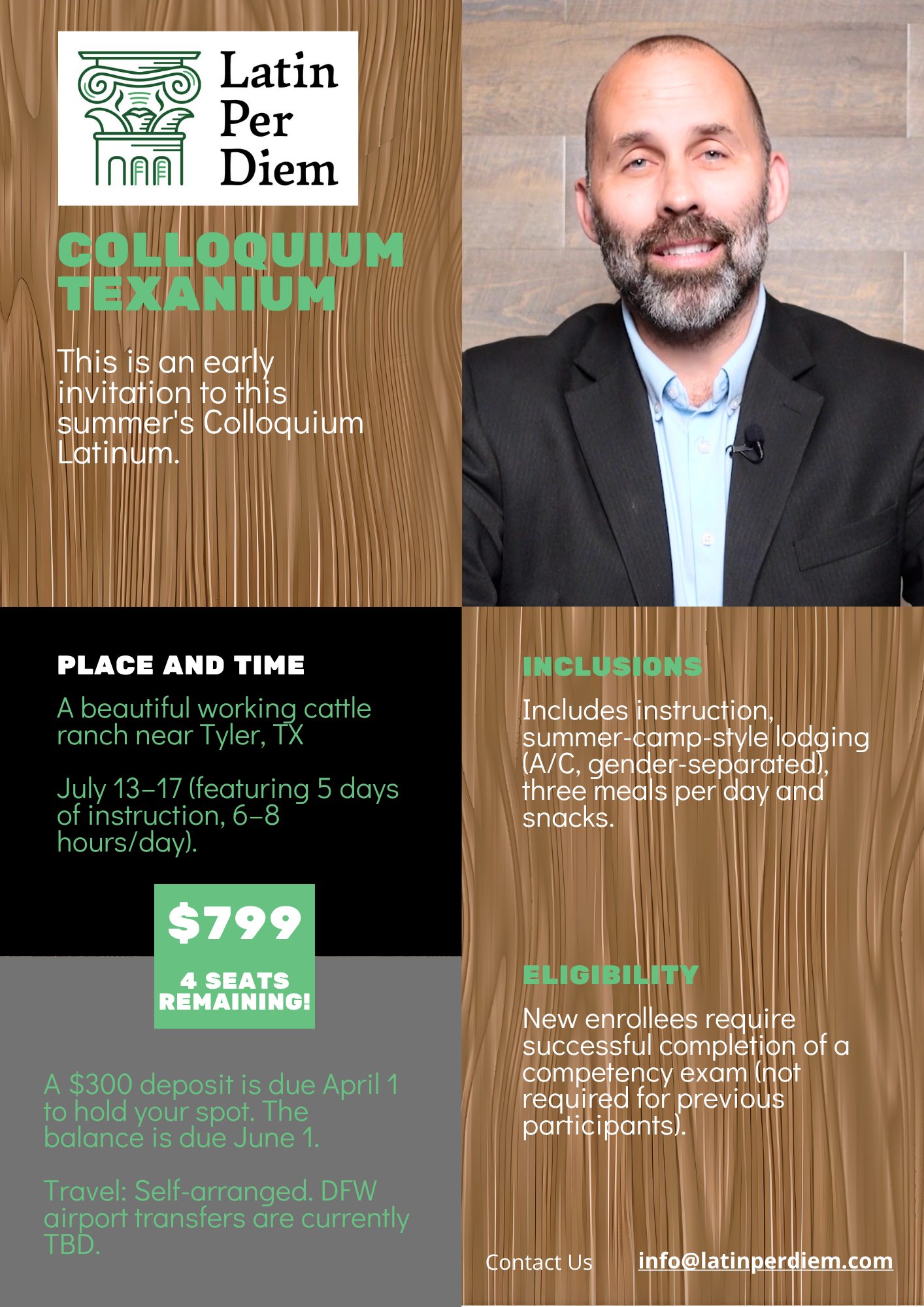 If you’re brand-new to our website, take a look around at our course offerings. If you have never studied Latin before, then you want to begin with our LLPSI Unit I class. This assumes no previous knowledge on the part of the learner. The course begins with pronunciation and gets you confident with reading Latin from the very first day. If you have studied LLPSI before or some other textbook or course, you are still encouraged to begin with Unit I. The reason for this is not to maximize our profit, but to make sure you have the best possible basis for future study. If you are a more advanced student and would like to take one of our MasterClasses, send Dr. Noe an email at info@latinperdiem.com and he will help you assess your ability level. You can also take one of our many, freely available quizzes: FREE QUIZZES.